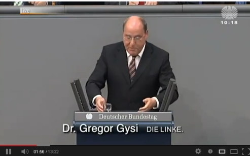 19.01.2013 02:25 Bundesregierung führt eine Politik von Versaille Wirtschaftspolitik - Gregor Gysi's Wutrede und Abrechnung mit der Regierung zur Verschuldung, Rettungspackete usw. [Quelle: youtube.com] JWD CDU/CSU, FDP, SPD und Grüne wollen kein soziales Europa, sondern ein HartzIV- Europa. Die einzige Mittelstandspartei sei Die Linke, denn nur sie wolle erreichen, dass durch bessere Löhne mehr Binnennachfrage erreicht wird. Deutschland habe als einzige Industrienation in den letzten 10 Jahren einen Reallohnrückgang (-4,5%) erlebt. Bundestagsrede vom 16.07.2012 von Dr. Gregor Gysi ..hier
