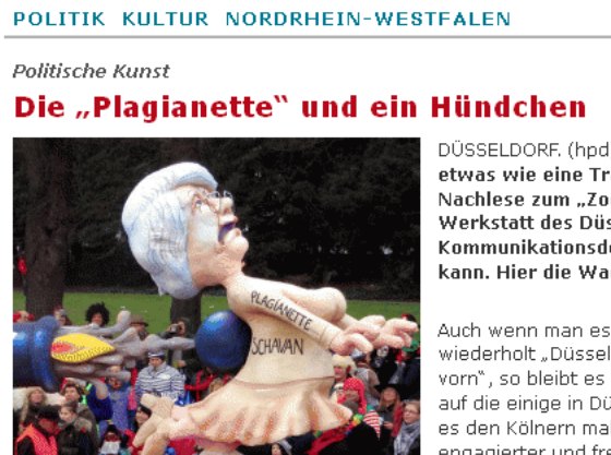 12.02.2013 13:20 Politische Kunst - Die „Plagianette“ und ein Hündchen” Düsseldorf - Es ist schon beinahe so etwas wie eine Tradition, dass der hpd als Nachlese zum „Zoch“ die Wagen aus der Werkstatt des Düsseldorfer Bildhauers und Kommunikationsdesigners Jacques Tilly zeigen kann. Hier die Wagen des Jahres 2013. [Quelle: hpd.de] JWD Auch wenn man es beinahe wie eine Formel wiederholt „Düsseldorf hat wieder die Wagen vorn“, so bleibt es dennoch richtig. Eine Tatsache, auf die einige in Düsseldorf stolz sind, dass man es den Kölnern mal wieder gezeigt hat, engagierter und frecher ist im Karneval als in der großen Domstadt. Link zum Artikel bei hpd.de: ![]() Srceenshot Link Anmerkung: Sehr schöne Aufnahmen der tollen Motivwagen gibt es im Originalbericht bei ' hpd.de ..hier' zu sehen. << zurück | Home |