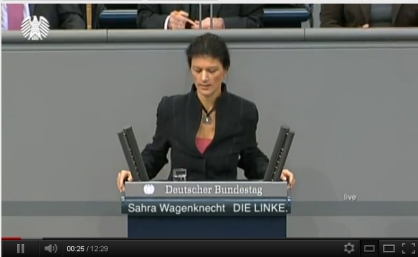 ![]() 27.01.2012 02:25 Eine Sternstunde im Parlament des Deutschen Bundestages mit Sahra Wagenknecht Berlin - Auf Youtube ist die Bundestagsrede von Frau Wagenknecht als Video eingestellt. Sie redet tacheles in Sachen Finanzmarktstabilisierungsgesetz. Ich würde jeden gesprochenen Satz unterstreichen. Auch Finanzminister Schäube hat aufmerksam zugehört. Seine Kanzlerin, die sich üblicherweise bei den Reden von Oppositionellen mit Ihrem Handy beschäftigt oder Schwätzchen hält, war gleichwohl nicht anwesend. JWD Wie in der Schule, gerade die, die es besonders nötig hätten passen nicht auf oder fehlen ganz. Naja, ohne Berater Ackermann hätte Merkel wohl eh nix verstanden und mit ihm vermutlich noch weniger. Da flirtet sie doch lieber mit Sarkozy und ruiniert weiterhin die Staaten mit ihrer absurden Verelendungspolitik. Armes Deutschland, armes Europa! - Gerne würde ich mal was Gutes über Merkel berichten, aber mir ist leider noch nichts zu Ohren gekommen. Vom organisierten Geld regiert zu werden, ist genauso schlimm, wie vom organisierten Verbrechen regiert zu werden." Mit diesem Zitat von Franklin D. Roosevelt beginnt Sahra Wagenknecht ihre Rede in der Debatte über das so genannte Zweite Finanzmarktstabilisierungsgesetz und erinnert daran, dass der damalige US-Präsident in seiner Regierungszeit den Finanzsektor massiv reguliert hat. In den drei Jahren seit Ausbruch der größten Finanz- und Wirtschaftskrise seit dem Zweiten Weltkrieg wurde die Öffentlichkeit mit Scheinaktivitäten hingehalten und getäuscht. [Quelle: Youtube] Link zum Video bei Youtube ..hier ![]() Rede von Sahra Wagenknecht in der Debatte des Deutschen Bundestages vom 26.01.2012 über das Finanzmarktstabilisierungsgesetz
