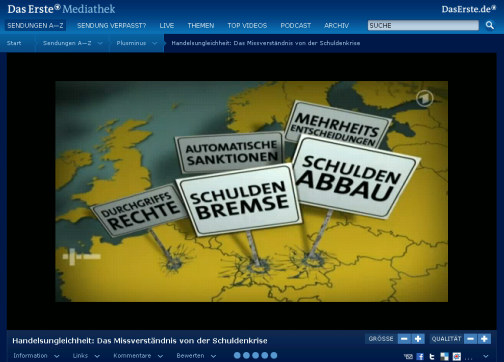 ARD-Plusminus - "Handelsungleichgewicht: Das Missverständnis von der Schuldenkriese" war der Titel der Sendung von Plusminus am 01.02.2012. In einer Rückschau sind die einzelnen Beiträge dokumentiert. [Quelle: DasErste.de]   JWD