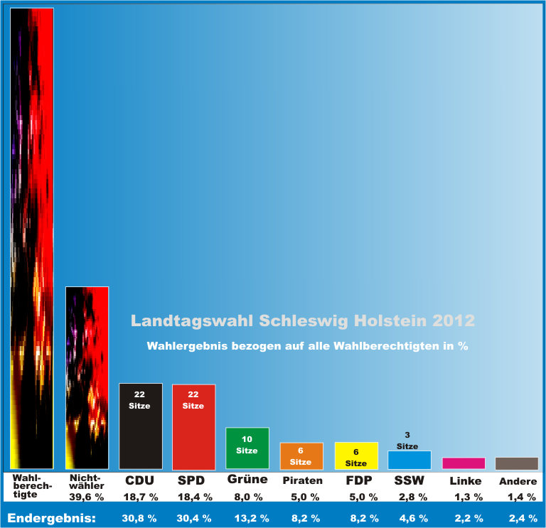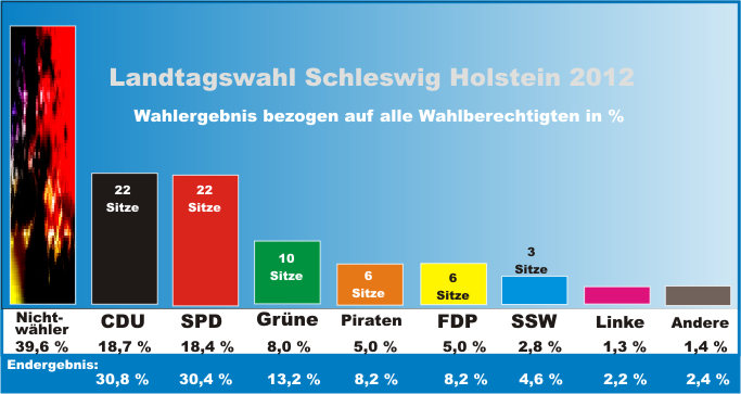 Kiehl - Die Landtagswahl hat unklare Machtverhältnisse in Schleswig-Holstein gebracht. Die bisher regierende CDU landete mit 22 Sitzen gleichauf mit der oppositionellen SPD. Die Grünen haben Stimmen gewonnen und sind drittstärkste Partei vor den Piraten und SSW geworden. Die FDP hat es trotz hoher Einbußen wieder in den Landtag geschafft. Die Linke ist deutlich an der 5%-Klausel gescheitert. Die Wahlbeteiligung lag bei nur 60%.  JWD