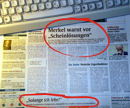 ![]() 28.06.2012 13:15 Die Scheinlösung Merkel warnt vor Scheinlösungen Woran erkennt man eine Scheingemeinschaft? Richtig! Man erkennt sie daran, dass es keine Solidarität gibt und durch niederträchtiges Handeln der Partner betrogen wird. Genau dass ist die Politik der scheinbaren Volksvertreterin Angela Merkel. Mit ihren Lenkern aus der Hochfinanz, sowie höriger Parteisoldaten, betreibt die Kanzlerin eine Politik, die auf Zerstörung bestehender sozialstaatlicher Strukturen und auf völlige Entmachtung der normalen Bürger hinausläuft. Getrieben von unersättlicher, kurzsichtiger Profitgier der Finanz- und Machtelite, verfestigt sich die Wahnsinnsidee, man könne die angeschlagenen (ausgemer(k)elten), in die Verschuldung getriebenen Partnerstaaten noch mehr ausquetschen. JWD Dabei geht es schon lange nicht mehr um legitime Politik und um die Wohlfahrt für den größten Teil der Menschen. Die neofeudalen Blutsauger und Bergruens* dieser Welt, sprechen ganz offen davon, dass sie sich Arbeitspreise wie in den ärmsten Regionen der Welt, auch in Europa wünschen. Wir alle sind diesem Irrsinn ausgeliefert. Leider ist auch vom Bildungsbürgertum kein Aufbäumen zu erwarten, wie Albrecht Müller in seinen Artikel vom 26.06. und 27.06.2012 am Beispiel von Jakob Augstein zutreffend analysiert. [Es steht schlecht um das kritische Bürgertum in Deutschland ..hier und ..hier] ![]() Solange ich lebe, verspricht Merkel, werde ich nie für die Schulden anderer geradestehen. [Quelle: Rheinpfalz 28.6.2012] Manche der mutmaßlich kritischen Bildungsbürger leben in der Illusion, Merkel würde pokern, um bei späteren Kompromissen das Beste für Deutschland herauszuholen. Was die Realität freilich auf den Kopf stellt. Kein Nachkriegspolitiker hat unseren individuellen gesellschaftlichen Fortschritt mehr zurückgebaut, die Gesellschaft endsolidarisiert und hat mehr Schulden aufgetürmt, als diese volkwirtschaftlich katastrophale, kontraproduktive schwäbische Hausfrauenpolitik unter der Regie von Angela Merkel. Als Anmerkung zu einem Artikel im ' herdentrieb.de ' (..hier), der sich mit Merkels taktischen Defiziten beschäftigt, schreibt ein Nachdenkseiten-Leser einen wohl treffenden Kommentar [Auszug]: [..] die Annahme (des Autors, Mark Schieritz), es handele sich bei der Position der Bundeskanzlerin um eine taktische, d.h., wenn die Gegenangebote stimmten, würde auch die Bundeskanzlerin ihre Position entsprechend korrigieren. Woher weiß er das? [..]. Ich glaube ja, es handelt sich hier bei Mark Schieritz um Wunschdenken, denn dazu gehört die implizite Unterstellung, dass die Kanzlerin die unterschiedlichen Positionen in der Volkswirtschaftslehre auch auf dem Schirm hat und wirklich handeln und verhandeln will und kann. Das denke ich nicht und zwar nicht nur deswegen, weil ich ihr diese Kompetenz schlicht nicht zutraue – von der Nähe zu konkreten Interessen ganz zu schweigen. [..] Ich komme immer mehr zu der Überzeugung, die Kanzlerin ist wirtschaftspolitisch ein blutiger Laie, der sich ideologisch “entschieden” hat, um die Unsicherheit los zu sein und daraus Erleichterung schöpft – eine ganz eigene Art von Realitätsflucht [..] [..] Die Dame hat sich m.M.n. ideologisch eingemauert. Sie wird diese Festung wohl auch nicht mehr verlassen, wenn man sie nicht wirklich dazu zwingt (oder überwältigende Umstände dies tun) – denn die Festung gibt ihr politische Sicherheit und auch das Narrativ – “ich verteidige den deutschen Sparer und wenn alles den Bach ‘runtergeht war die “Schuldenkrise” schuld”. [..] Es ist für die Kanzlerin politisch einfach zu verlockend, sich derartig zu verhalten – zumal ihr die bürgerliche Presse zur Seite stehen wird. Und dann ist es irgendwann schlicht zu spät…aber dann ist ja die Schuldenkrise schuld. [Auszug Ende] [Quelle: nds.de ..hier] So ticken die Macher der Wallstreet, deren Vorgaben sich die restliche Welt zu unterjochen hat: *) Nikolas Berggruen ein Freund von Schröder: Artikel vom 16.03.2012 [Auszug] Berggruen: Politiker wolle er nicht werden, die müssten Kompromisse machen. Die Idee sei aber gerade, keine Kompromisse zu machen. Wie soll man sich das vorstellen? Kann es Chancengleichheit und Gerechtigkeit geben ohne Kompromisse zu machen? Wie sieht aber eine Gesellschaft aus, bei der es keinen Kompromiss zwischen Profit und Menschlichkeit, oder zwischen arm und reich gibt? Neoliberal? Wie der Westen schritt halten kann in einer globalisierten Welt: Wir leben länger, wir haben die Kapazität vielleicht mehr zu arbeiten, die Konkurrenz arbeitet härter und länger, wir haben viel mehr Konkurrenz von allen anderen Länder der Welt. Wenn wir unser 'Standard & Living' halten wollen, oder relativ halten wollen, dann müssen wir unser Leben ändern, wir müssen unsere ganze Sozialpolitik durchdenken. Was will Berggruen uns damit sagen? Wessen Standard & Living ist denn da mit dem Begriff 'unser' bemeint.) Für die Allgemeinheit gilt wohl immer der unterste Level, während für seinen Stand immer der Höchste gilt. Dass er mit seinen weltweiten, so genannten Zukunftsinvestitionen tausenden Menschen die Existenz nimmt, ist für ihn ohne Relevanz. Ob es sich dabei überhaupt um richtige Menschen, mit eigenen berechtigten Ansprüchen handelt bleibt ungeklärt. Seine Holding gleicht eher einem Syndikat, denn einer halbwegs seriösen Unternehmung. Briefkastenfirmen, Firmensitze auf den niederländischen Antillen, ein undurchsichtiges Geflecht, welches doch wohl alles seiner eigenen Stiftung gehört. Nach Steuern zahlen wollen, sieht dass nicht unbedingt aus... Link zum Artikel vom 16.03.2012 ..hier Fiskalpakt & ESM Hinweis: Wer sich der Verfassungsbeschwerde von „Mehr Demokratie“ anschließen möchte, siehe ..hier