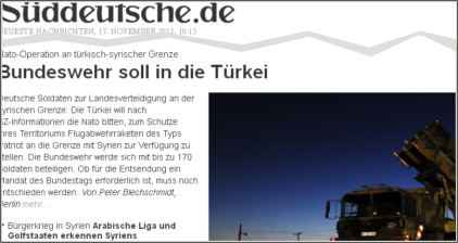 ![]() 17.11.2012 11:50 Kriegs- alias Verteidigungsminister Thomas de Maizière schickt Bundeswehrsoldaten in die Türkei Die Türkei hat ihren Auftrag erfüllt und die Nato in den anstehenden Krieg gegen Syrien hineingezogen. Genau so, wie es die Herren von der Wallstreet von ihren Handlangern erwartet hatten. In vorauseilendem Gehorsam schickt unser Kriegministerium bereits Soldaten an die Front, noch bevor das Hilfsersuchen offiziell gestellt ist. JWD Das der überraschende Besuch unseres Kriegministers* letzte Woche in Afghanistan mit dieser Angelegenheit in Verbindung steht wäre nicht unlogisch, denn dort ist die deutsche Truppenstärke in jüngerer Zeit angeblich von einst bis zu 5350 auf derzeit 4760 Soldaten verringert worden. Außerdem sind ja viele talibanische Terroristenfeinde von Gestern, jetzt zu Verbündeten in Libyen und Syrien geworden. Links zu einer Meldung von ' sueddeutsche.de ' ..hier ![]() Passend zum Thema: Artikel vom 13.11.2012 Westerwelle: Deutsche Unterstützung für Rebellen im syrischen Untergrund Geld stinkt nicht, so jedenfalls eine Redensart, die in der realen Welt häufig Entsprechungen findet. Waffengeschäfte sind schließlich auch Geschäfte. Besonders widerlich wird es, wenn zur öffentlichen Begründung mit edlen, humanitäre Argumenten die Wirklichkeit ad absurdum geführt wird. Die massenmediale Kriegspropaganda funktioniert gewohnt unkritisch. ..mehr Artikel vom 09.10.2012 Die Türkei versucht, die NATO in einen Krieg mit Syrien hineinzuziehen Tony Cartalucci untersucht die Hintergründe für die Zuspitzung des Konfliktes um Syrien und warnt vor einem Eingreifen der NATO. [Quelle: luftpost-kl.de] ..mehr Anmerkung: Es ist eine Tatsache, dass Krieg immer offener und unverblümter Mittel der Politik, genauer der neoliberalen Machergreifungsstrategie wird. Das gilt in besonderem Maße und für jeden offenkundig für die USA. Die ihrerseits versucht, die strategischen Kosten auf ihre Vasallen abzuwälzen. Wir wären gut beraten, würden wir uns dem Paradigmenwechsel entgegenstemmen, unsere humanistischen Werte hochhalten und unser Grundgesetz mit allen gebotenen Möglichkeiten verteidigen. Das sollte die Lehre aus 100 Millionen Toten in zwei Weltkriegen sein, die von unserem Land ausgegangen und zu verantworten sind. *) Kriegsministerium war in früheren Zeiten die Bezeichnung für die oberste Staatsbehörde für das Kriegswesen. An der Spitze stand der Kriegsminister, [..]. In militärischer Hinsicht leitete [er] das Kriegsministerium [..] Die heutige Bezeichnung ist in der Regel Verteidigungsministerium, was von manchen als Euphemismus angesehen wird. [Quelle: Wikipedia ..hier]