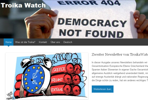 ![]() 30.01.2014 14:50 Troika-Watch gestartet Nichtregierungsorganisationen wie das Corporate Europe Observatory und Netzwerke Sozialer Bewegungen wie Attac und die 15M-Bewegung haben am Dienstag das Internetportal »Troika-Watch« gestartet. Die internationale Beobachtungsstelle will zukünftig über die Auswirkungen der von der Troika-Politik betroffenen Länder berichten. JWD Ein Schwerpunkt der Internetseite wird der Widerstand und die Vernetzung der Opposition sein. Monatlich soll zudem ein Newsletter in neun Sprachen veröffentlicht werden, um »sicherzustellen, dass alle aktiven Bürger alle notwendigen Informationen zur Hand haben«, und zu helfen, die »Kämpfe in den unterschiedlichen Ländern zu verbinden«, heißt es in einer gemeinsamen Pressemitteilung. [Quelle: neues-deutschland.de Link zur Homepage ' troikawatch.net/de/ ' ..hier ![]() [Screenshot | Quelle: troikawatch.net/de 30.01.2014] Was ist die Troika? [Quelle: Homepage ' troikawatch.net '] Auszüge: Der Name Troika kommt ursprünglich von dem russischen Wort für einen Wagen mit drei Pferden, kann aber auch dazu benutzt werden, jede Art von Zusammenarbeit von Dreien zu beschreiben. Im Kontext der Europäischen Krise geht es bei der Troika um die folgenden drei Institutionen: